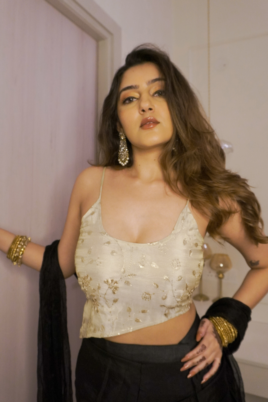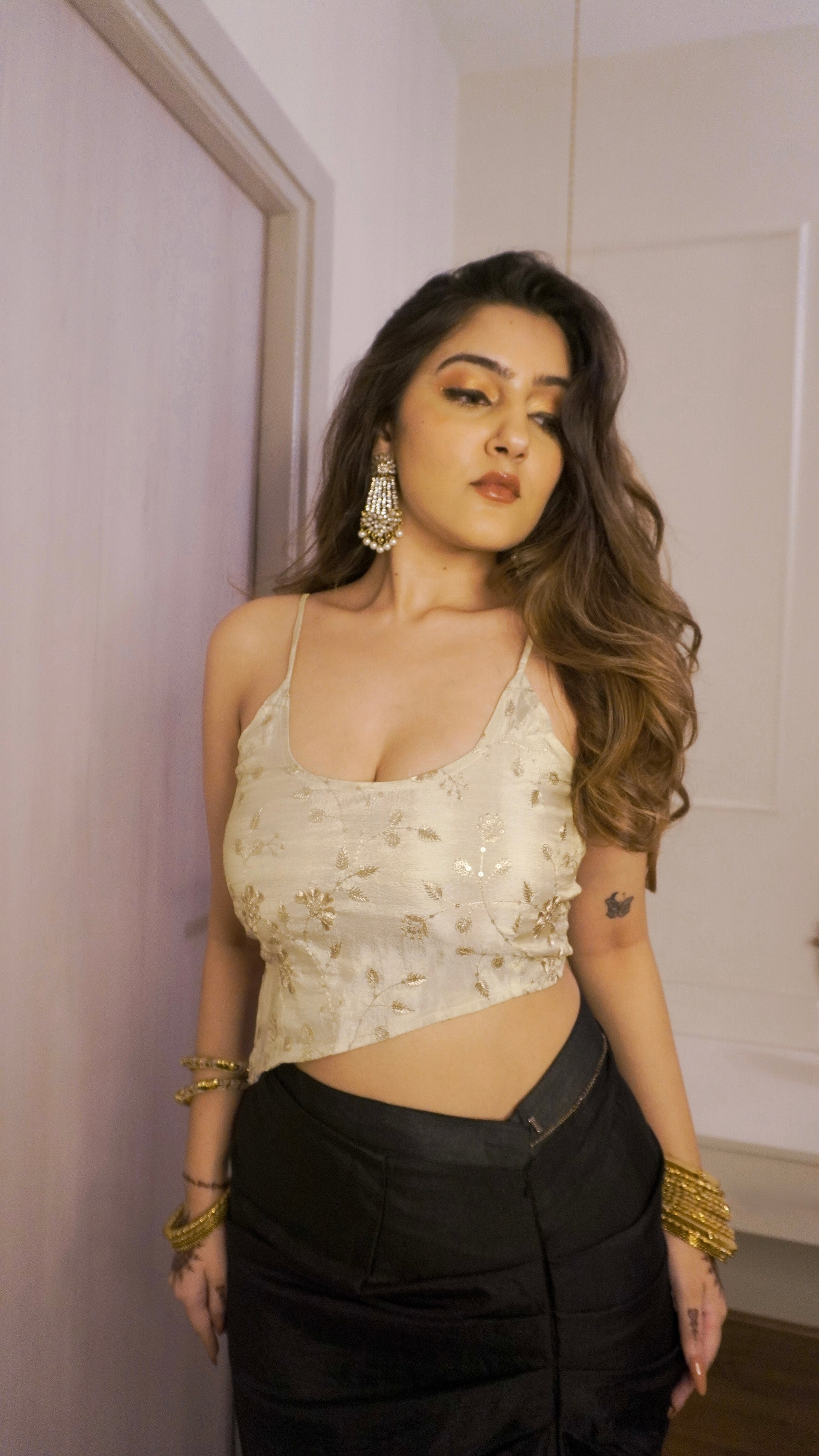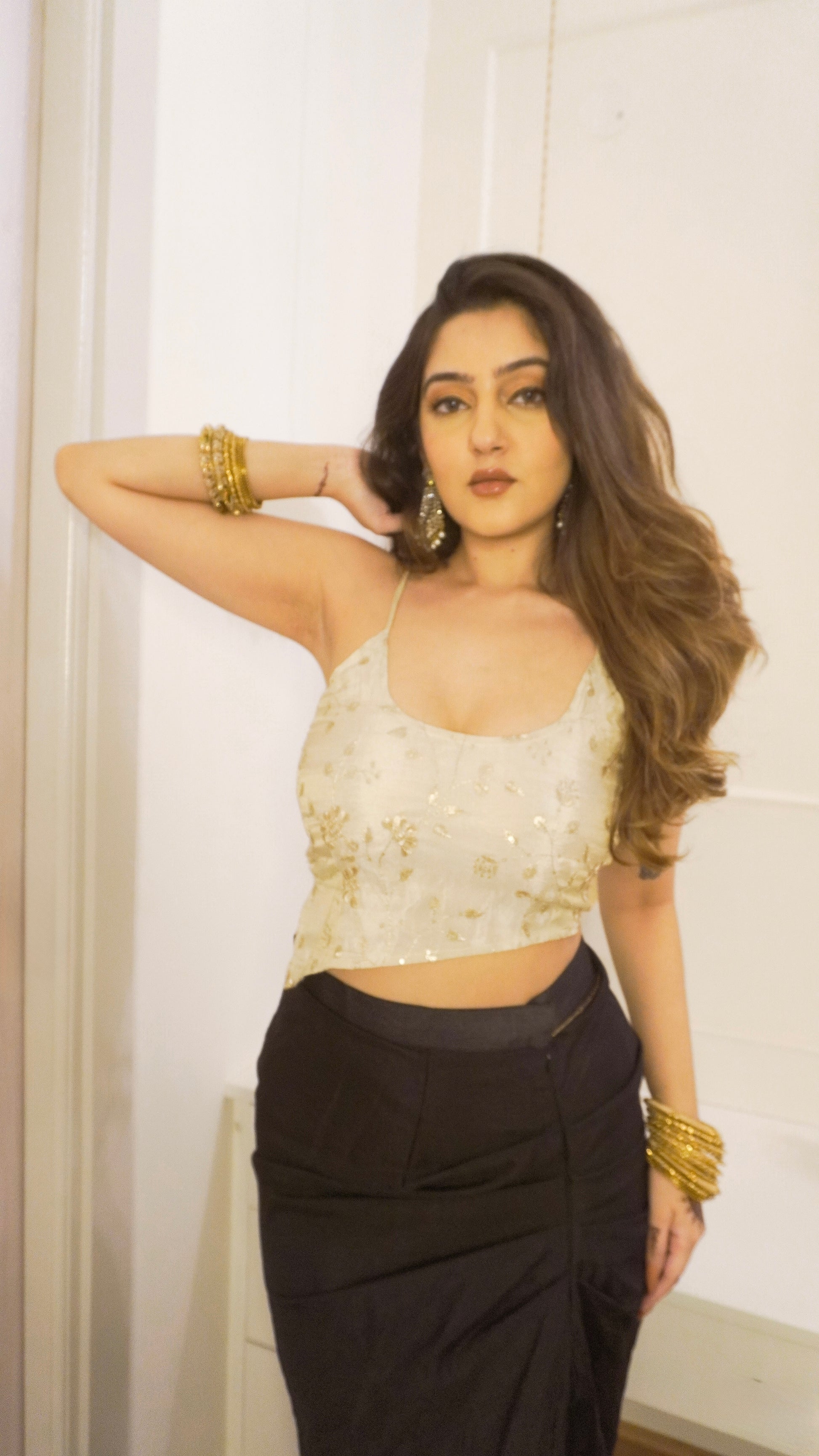 Made in premium quality tissue material, this top comes with golden thread work and an asymmetrical shape! A tribute to Bebo's 2000's on screen legacy!
